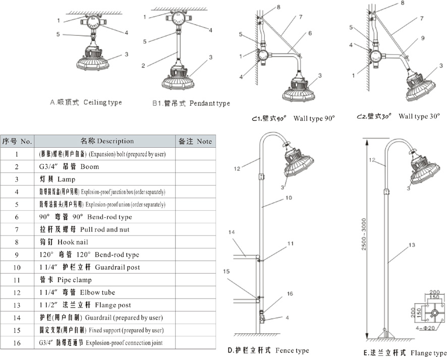 Note: 1. Select according to the product model description, pay attention to marking out the ex-mark;e.g.: Need product of 40W, 220V, pendant type, with junction box,gas explosion-proof, then the model should beDED410-40gH ExdIICT6 Gb;